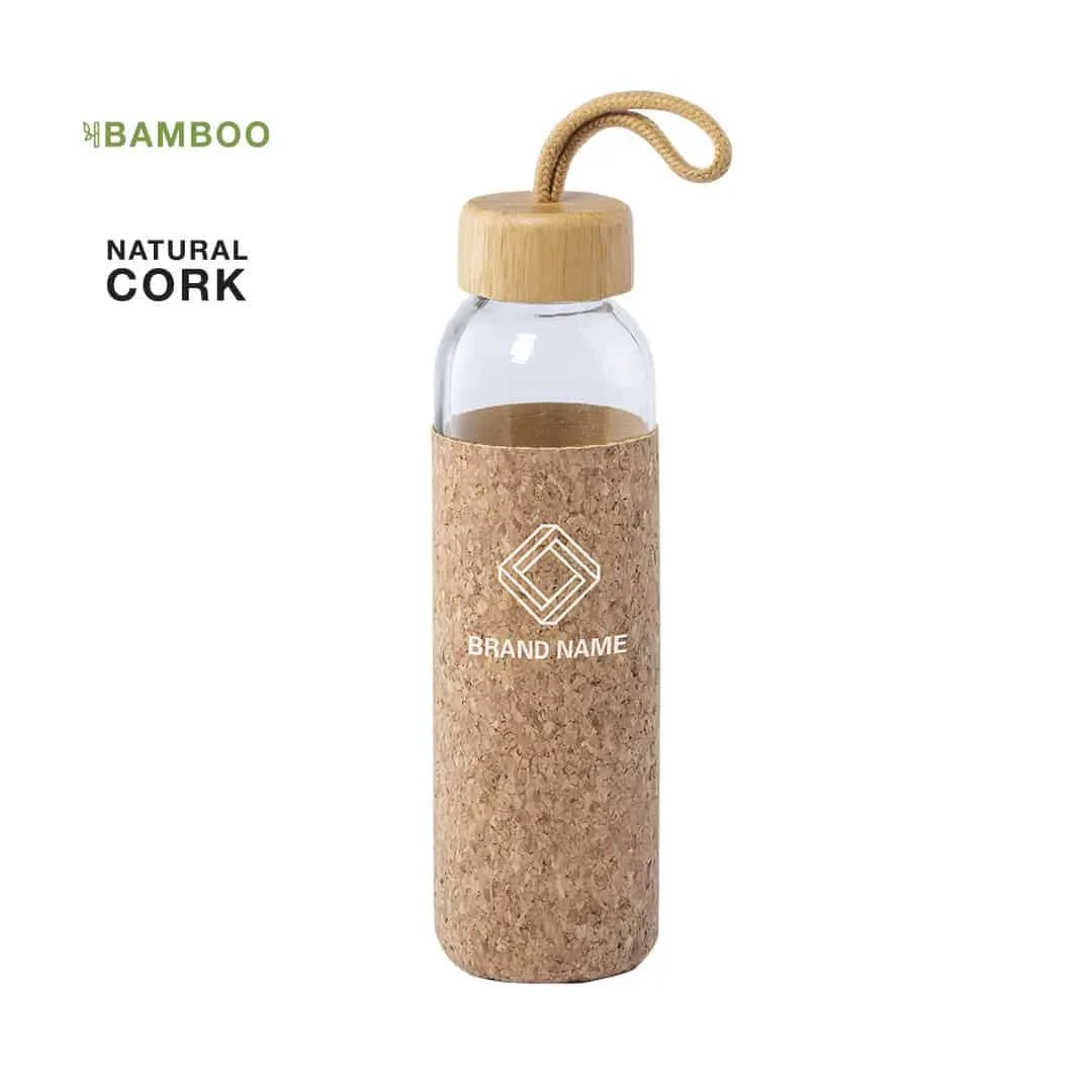 Glastrinkflasche mit Korkmantel und Schraubdeckel mit Trageschlaufe aus Bambus.