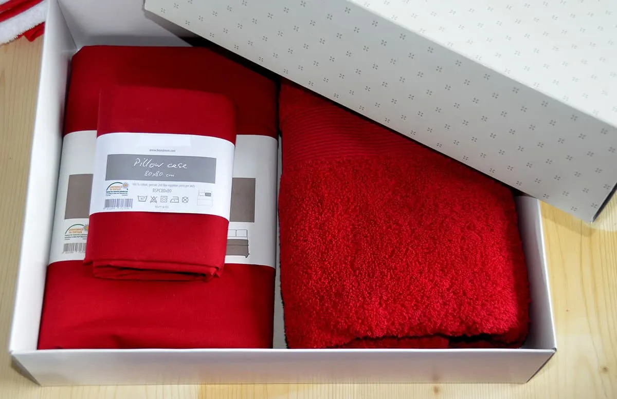Sehr schöne Geschenkbox mit Handtuch und Bettwäsche eine echte Bereicherung für Ihr Heim, hierüber werden sich Ihre Kunden freuen.