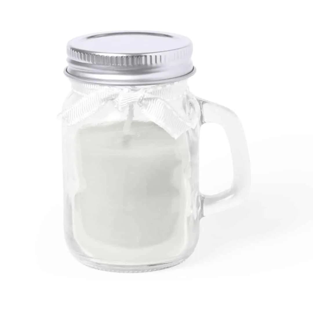 Henkelglas mit Duft Kerze in den Standardfarben rot, blau, weiss – andere Farben auf Anfrage – mit schöner Geschenkschleife und wieder verschließbarem Deckel