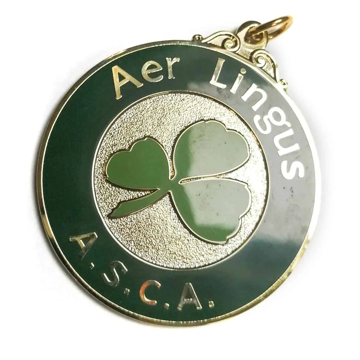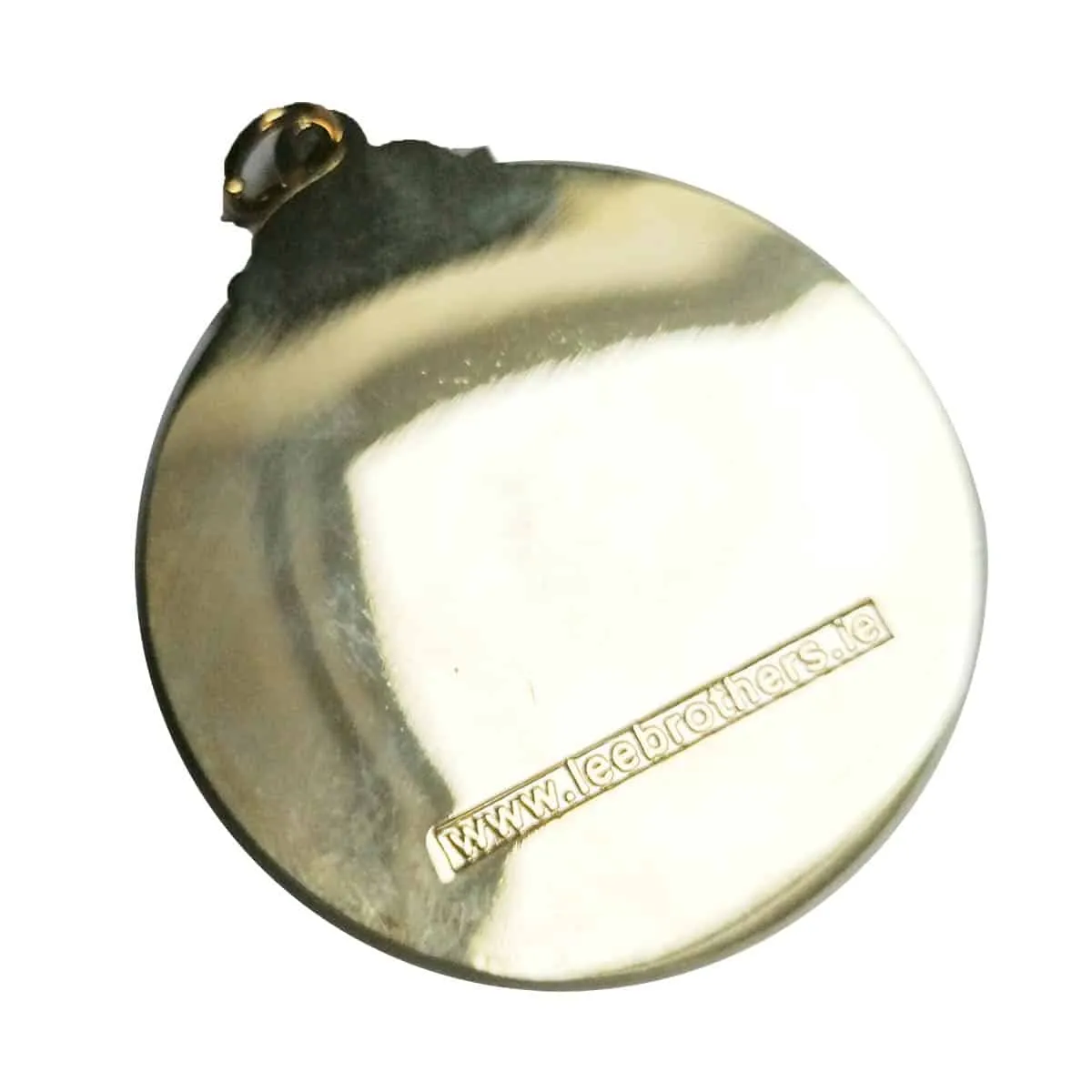 Das abgebildete Beispiel ist goldfarbig mit speziellem Effekt in der Mitte. Die reliefvertieften Flächen sind mit farbigem Kunstharzlack ausgefüllt und zusätzlich mit einem Schutzlack überzogen.