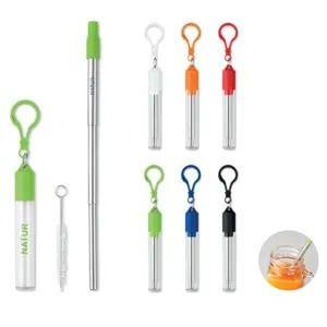 nachhaltiger wiederverwendbarer Strohhalm, einfach zum Mitnehmen in einer Kunststoffhülse mit Karabiner.